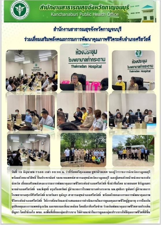 ว่าที่ร้อยตรีศุภมงคล บูชาถ่ายเทศ รองผู้ว่าราชการจังหวัดกาญจนบุรี ร่วมกับรองนายแพทย์สำนักงานสาธรณสุขจังหวัดกาญจนบุรี เยี่ยมเสริมพลังคณะกรรมการพัฒนาคุณภาพชีวิตระดับอำเภอศรีสวัสดิ์ ซึ่งนำทีมโดย นายธนยศ หิรัญเนตร นายอำเภอศรี สำนักงานสาธารณสุขอำเภอศรีสวัสดิ์ โรงพยาบาลท่ากระดาน อสม. องค์กรปกครองส่วนท้องถิ่นตำบลท่ากระดาน และภาคีย์เครือข่าย พร้อมทั้ง ลงพื้นที่เยี่ยม ผู้ป่วยติดเตียง ที่ต้องได้รับความช่วยเหลือในพื้นที่ ตำบลท่ากระดาน